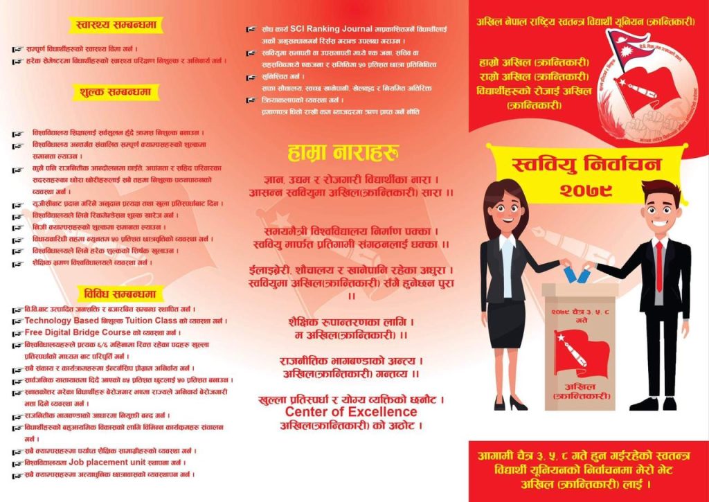 यस्तै, अध्यक्ष पञ्चा सिंहले स्ववियु निर्वाचन विद्यार्थी नेतृत्वविहीनताको अवस्था अन्त्य गर्नका लागि स्ववियु निर्वाचन अखिल क्रान्तिकारीको संकल्पमा त्रिभुवन विश्वविधालय, नेपाल संस्कृत विश्वविधालय, मध्यपश्चिम विश्वविधालय र सुदूरपश्चिम विश्वविधालय गरी ४ ओटा विश्वविधालयमा अखिल क्रान्तिकारी प्रमुख प्रतिस्पर्धी रहेको बताइन्।