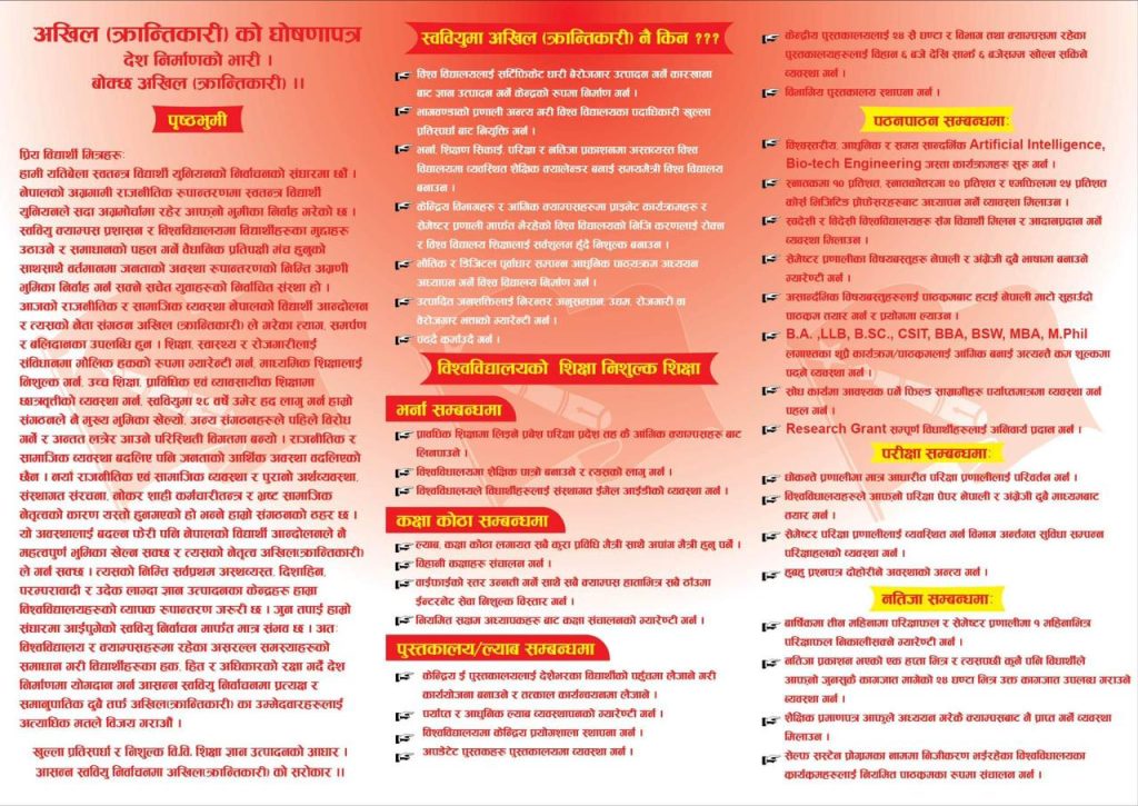 कार्यक्रममा बोल्दै घोषणापत्र लेखन समितिका संयोजक तथा उपाध्यक्ष खनालले अखिल क्रान्तिकारीलाई विजय गराए शिक्षाको माग सम्बोधन गरिने विश्वास दिलाएका छन् ।