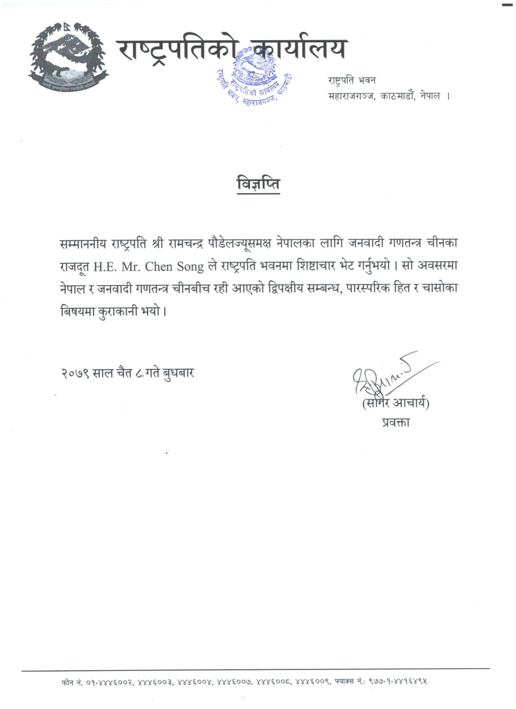 काठमाडौं । राष्ट्रपति रामचन्द्र पौडेलसँग चीनका राजदूत चेन सोङले शिष्टाचार भेट गरेका छन् ।