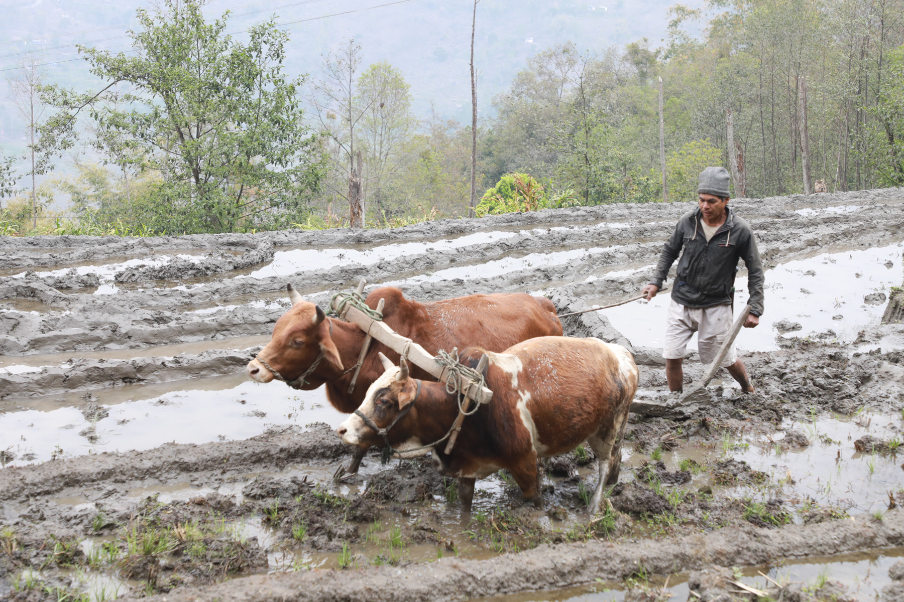संखुवासभा जिल्लाको धर्मदेवी नपा– ४ छुमुङमा चैते धान रोप्नका लागि गोरूमार्फत् खेत जोट्दै कृषक परिवार । यस क्षेत्रमा वर्षको दुईपटक धान रोप्ने गरिन्छ । तस्बिर :रत्न श्रेष्ठ/रासस