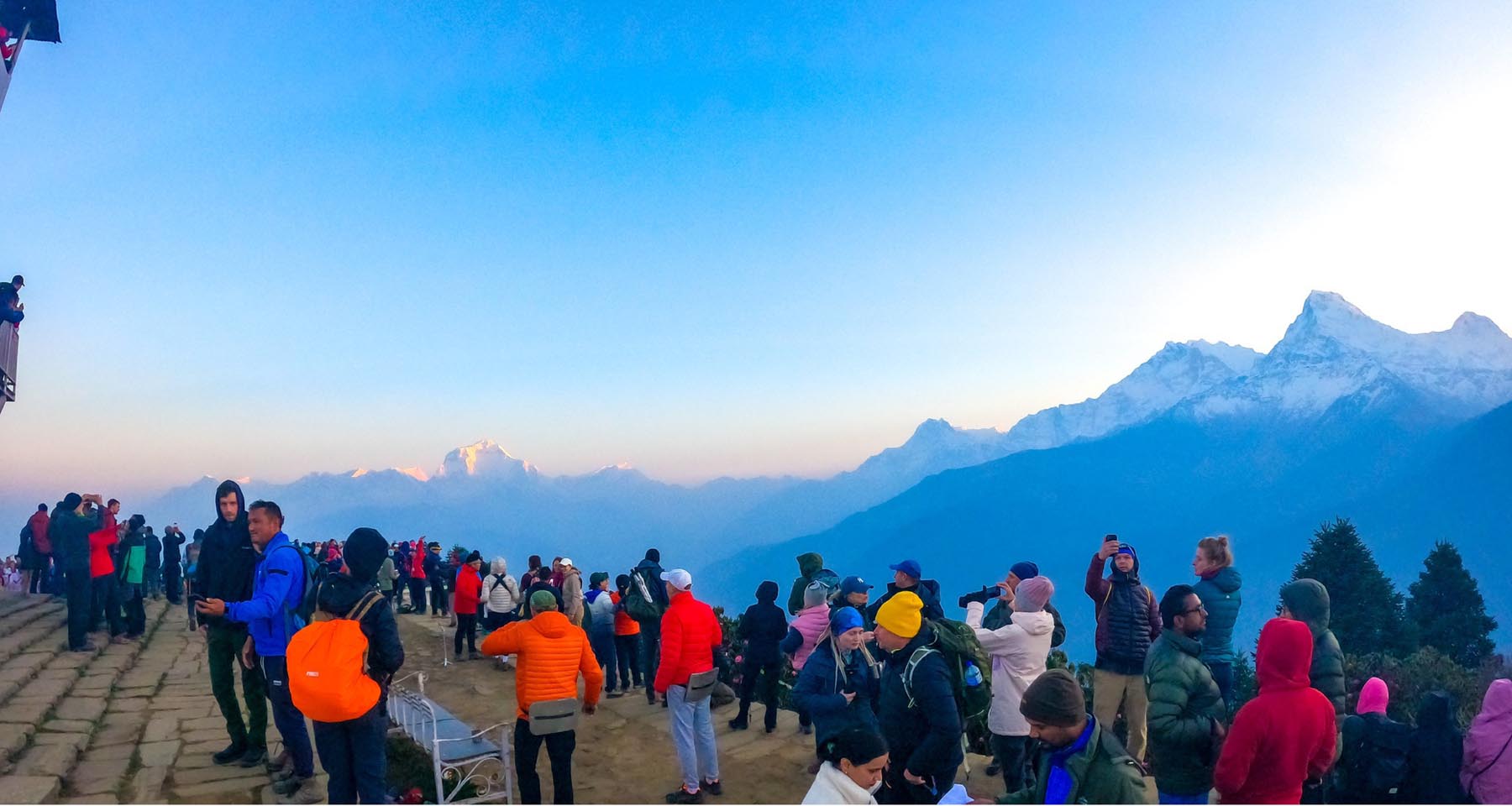 म्याग्दीको अन्नपूर्ण गाउँपालिका–६ स्थित पुनहिलबाट हिमशृङखला र सूर्योदयको अवलोकन गर्दै पर्यटक । समुद्री सतहदेखि तीन हजार २१० मिटर उचाईमा अवस्थित पुनहिलमा पर्यटकको चहलपहल बढेको छ ।