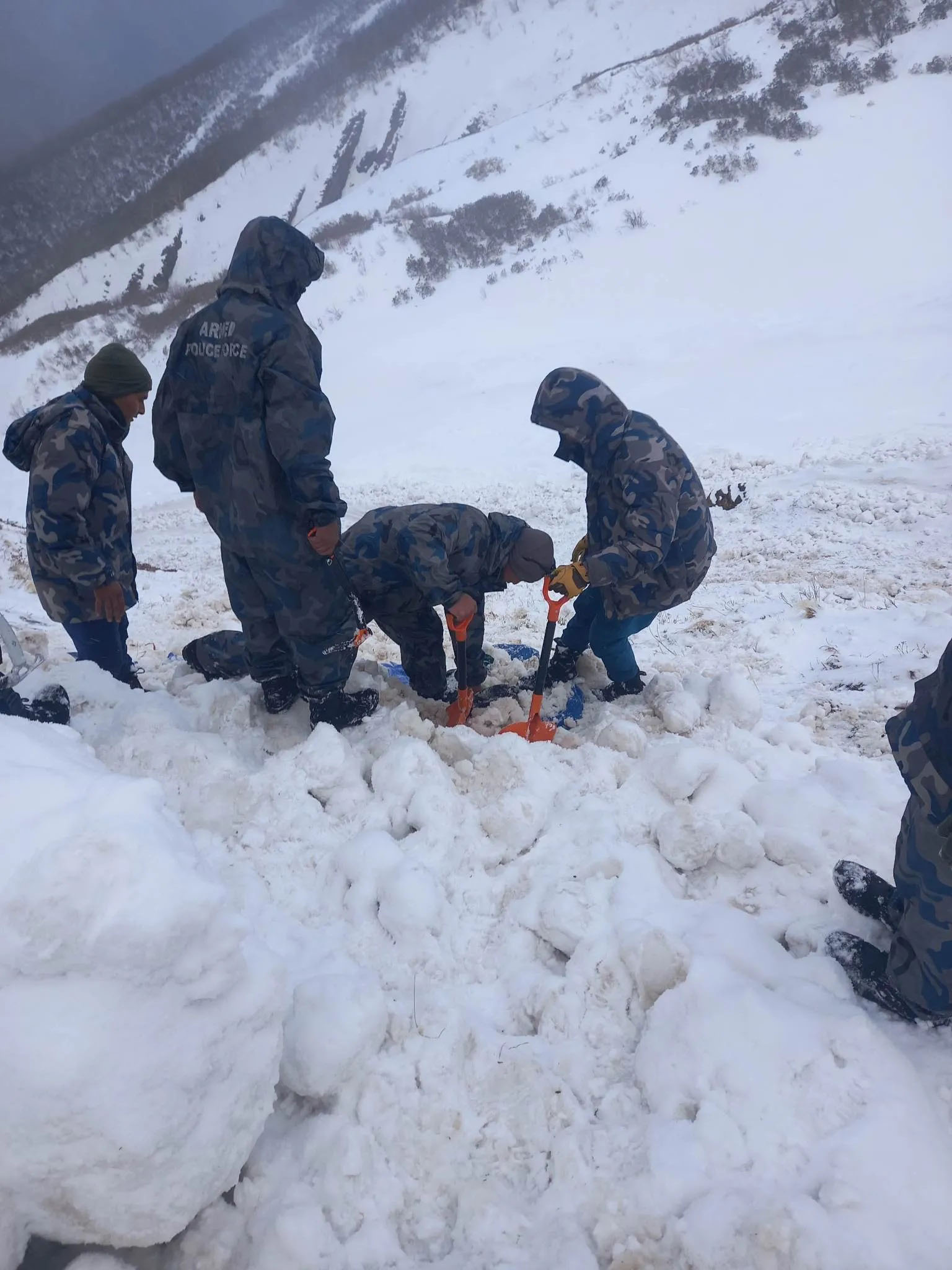 दार्चुलाको ब्याँस गाउँपालिका–१ बोलिङ्गमा मङ्गलबार दिउँसो हिमपहिरोमा परी यार्सागुम्बा संकलक बेपत्ता भएपछि उद्धारमा खटिएका सशस्त्र प्रहरी बल नेपाल, नम्बर ५० गुल्म छाङरुको टोली । उक्त घटनामा परी एक पुरुष र चार महिला बेपत्ता भएका छन् ।