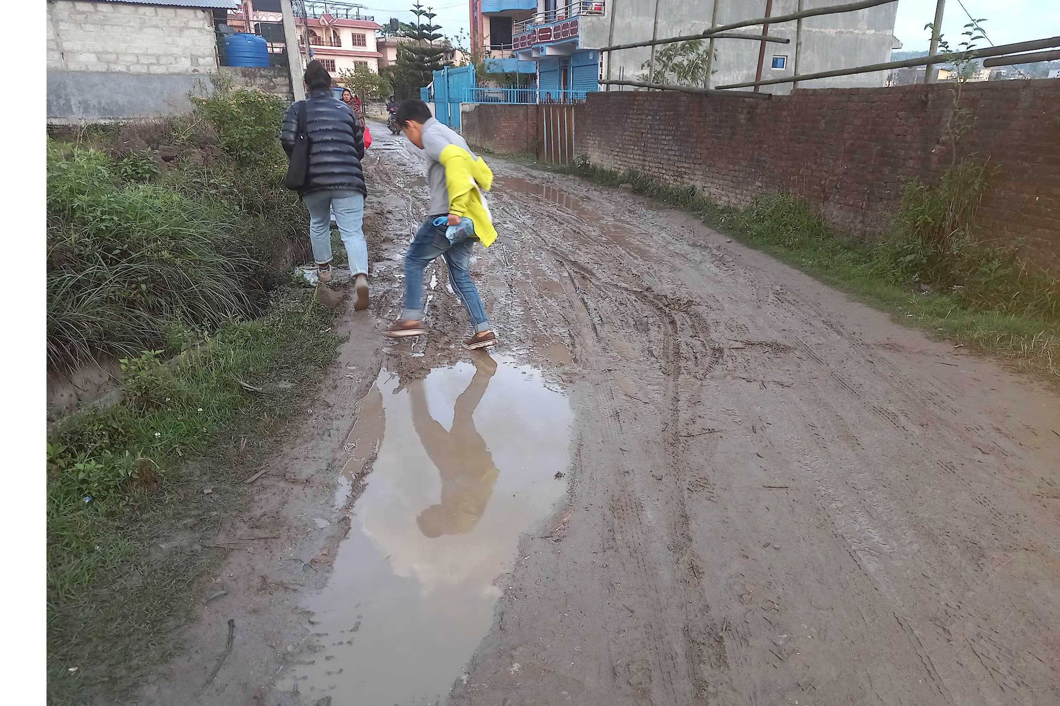 काठमाडौँको उत्तरपूर्वी भेगस्थित गोकर्णेश्वर नगरपालिका वडा नं १ रुप्सेटारमा विसं २०७४ देखि नै नगरपालिकाले बजेट विनियोजन गर्दै आएको नयाँपाटी उकालो (कारखाना) बाट वाग्मती नदी हुँदै भद्रवास निस्कने सडकको दूरावस्था । नगरपालिकाले उपभोक्ता समिति गठन गरेर सडकको काम दिने गरेपनि काम भने गुणस्तरीय हुन नसक्दा यात्रु एवं स्थानीयवासी वर्षामा हिलो र हिउँदमा धुलोले पीडित हुने गरेका छन् । तस्बिर: पूर्णप्रसाद मिश्र/रासस