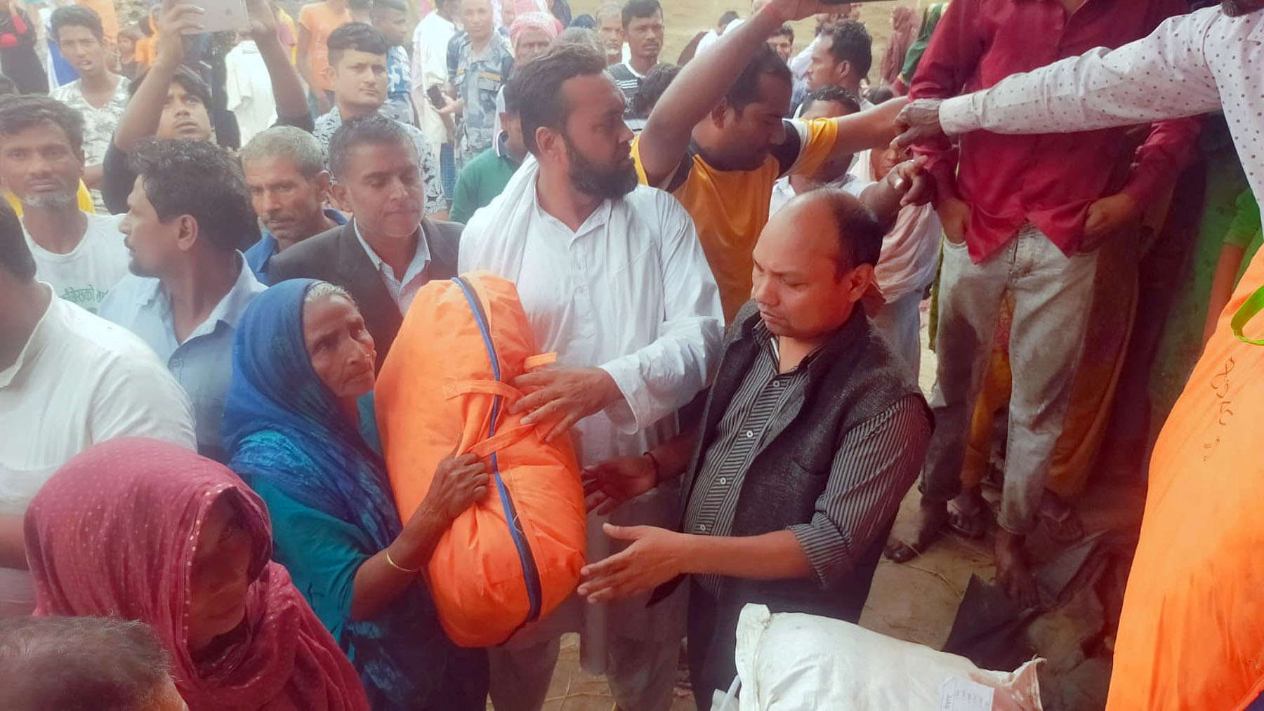 दलित सरोकार मञ्च नेपालले सप्तरीको कञ्चनरुप नगरपालिका– १ बैरवा पोटरी हटियास्थित मुस्लिम टोलमा भएको आगलागीपीडित परिवारलाई बुधबार राहतमा खाद्यान्न र ब्लैंकेट वितरण गर्दैै मञ्चका कार्यकारी निर्देशक भोलाकुमार पासवानलगायत । तस्बिर: अरुणकुमार यादव/रासस